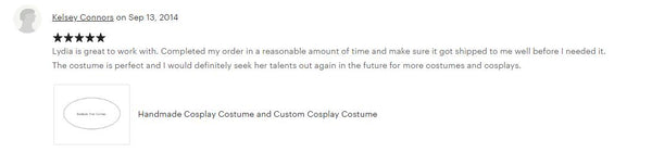 Lydia is great to work with. Completed my order in a reasonable amount of time and make sure it got shipped to me well before I needed it. The costume is perfect and I would definitely seek her talents out again in the future for more costumes and cosplays.